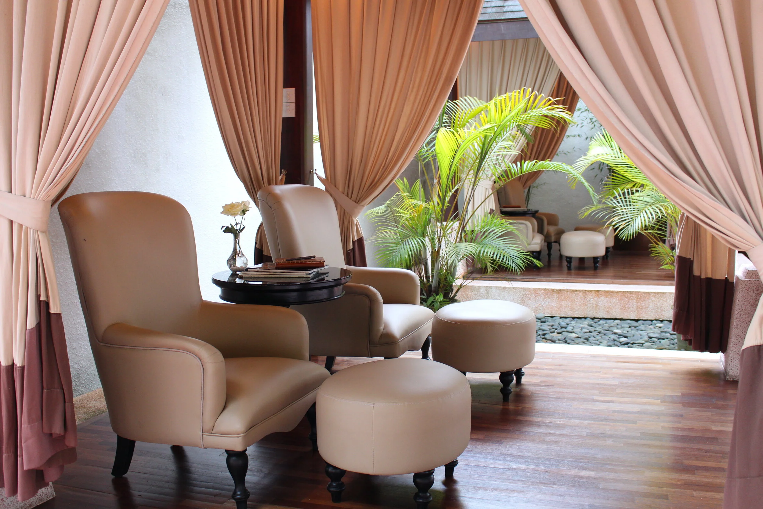 The spa complex isn’t huge here but you could still spend a half day relaxing in it. The entrance also forms a shop where you can buy products afterwards, then there is a tea area where you are served refreshments while completing your health assessment form, a lounge area and the treatment rooms. There is a gym too which is large and well-equipped so you could always do a work out here and then head in for your treatment. The lounge area was our favourite area; day beds with warm blankets and an abundant array of magazines overlooking a water feature where we could have happily whiled away a few hours resting after our massages listening to the sound of tinkling water.