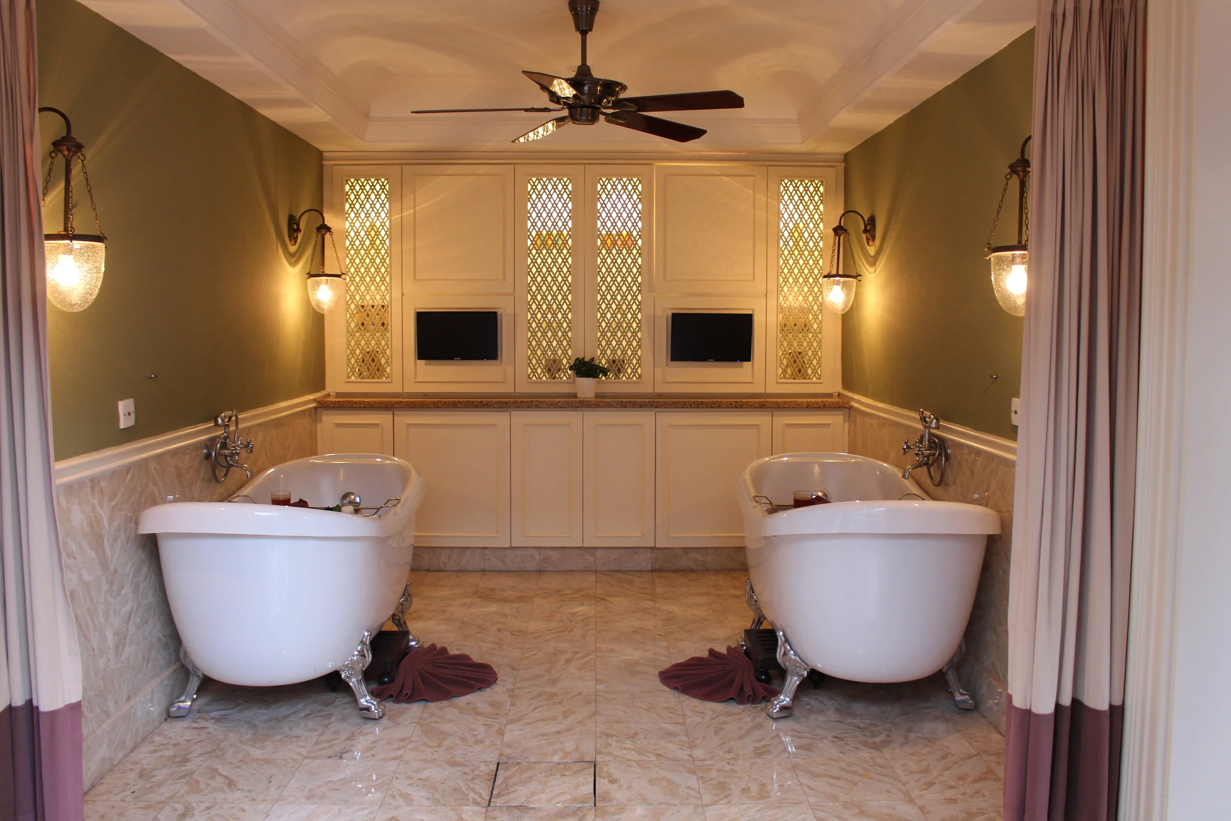 First, we were led to a room where a bath had been set up with rose tea infused water and sprinkled with rose petals. Deliciously warm and really fragrant, this is a great idea and one which would be great prior to any massage as it warms you up and instantly relaxes you. The only down side is it can leave you cold if you’re not in very warm conditions or taken straight to your massage bed.